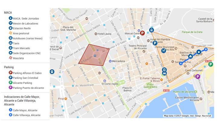 La zona del casco antiguo de Alicante está restringida al tráfico, siendo la mayoría de sus calles peatonales. Por ello, el acceso al MACA sólo puede hacerse caminando. Os recomendamos el trayecto por la calle Mayor desde La Rambla, una de las vías principales de la ciudad.
